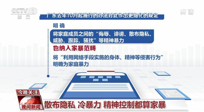 精神家暴的表现形式很多样,比如散布隐私。广东去年10月起施行的办法对此作出更细化的规定,明确将家庭成员之间的“侮辱、诽谤、散布隐私、威胁、跟踪、骚扰”等精神暴力也纳入家暴范畴,同时将“利用网络手段实施的身体、精神等侵害行为”明确为家庭暴力。