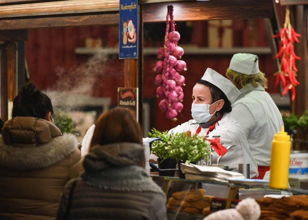 11月22日,在德国法兰克福圣诞市场,戴口罩的工作人员为顾客服务。(新华社记者逯阳摄)