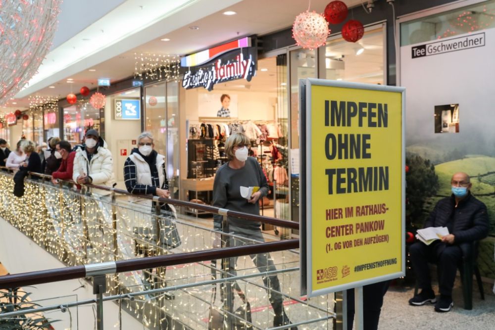 11月25日,在德国首都柏林的一座购物中心内,人们排队等候进入新冠疫苗接种站接种疫苗。(新华社记者单宇琦摄)