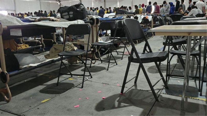 从拘留中心传出的图片显示,双层儿童床只有桌子的高度。新冠肺炎、流感等已在这一设施内暴发,需要搭建专门的帐篷容纳患病儿童。已经离开这里的孩子说,提供给他们的鸡肉还带着血。