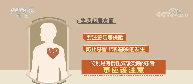 生活起居方面:要注意防寒保暖,防止感冒、肺部感染的发生,特别是有慢性肺部疾病的患者,更应该注意。