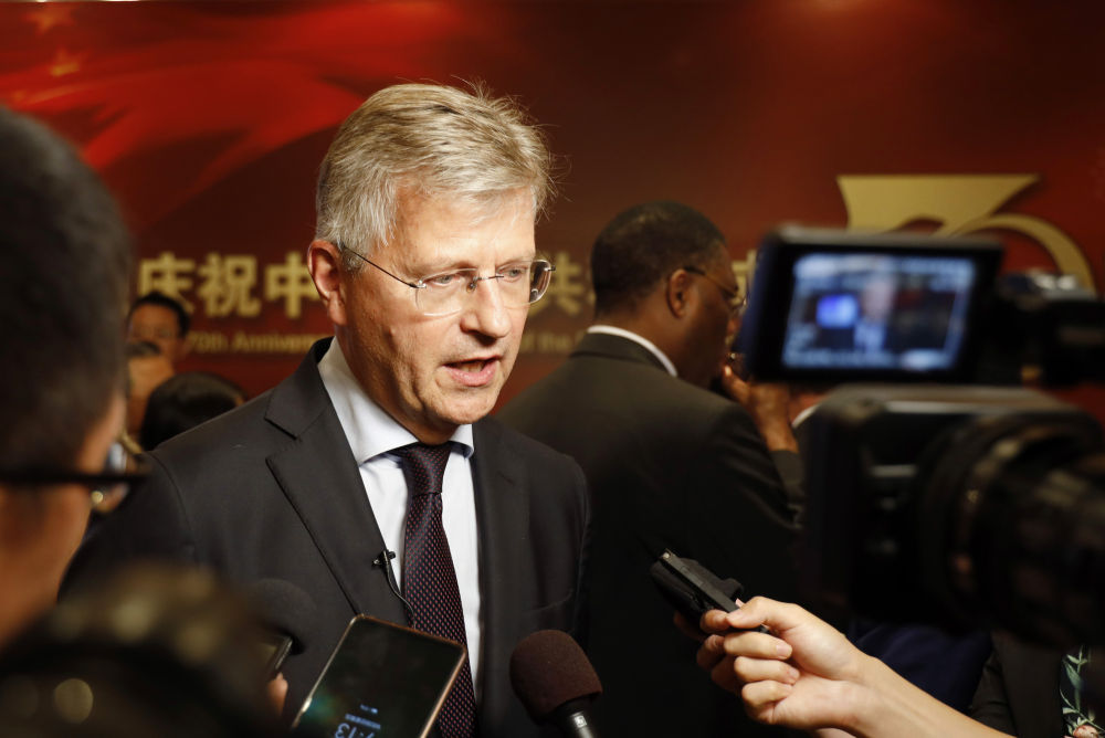 2019年9月20日,在美国纽约,联合国负责维和事务的副秘书长拉克鲁瓦在中国常驻联合国代表团举办的庆祝中华人民共和国成立70周年招待会上接受中国媒体采访。(新华社记者李木子摄)