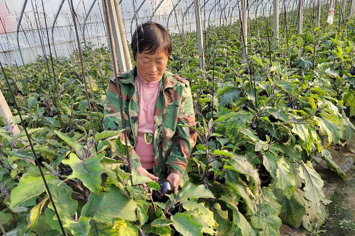 25日,山东省莘县董杜庄镇菜农韩贵英正在大棚里采摘茄子(姜婷婷摄)。(受访者供图)
