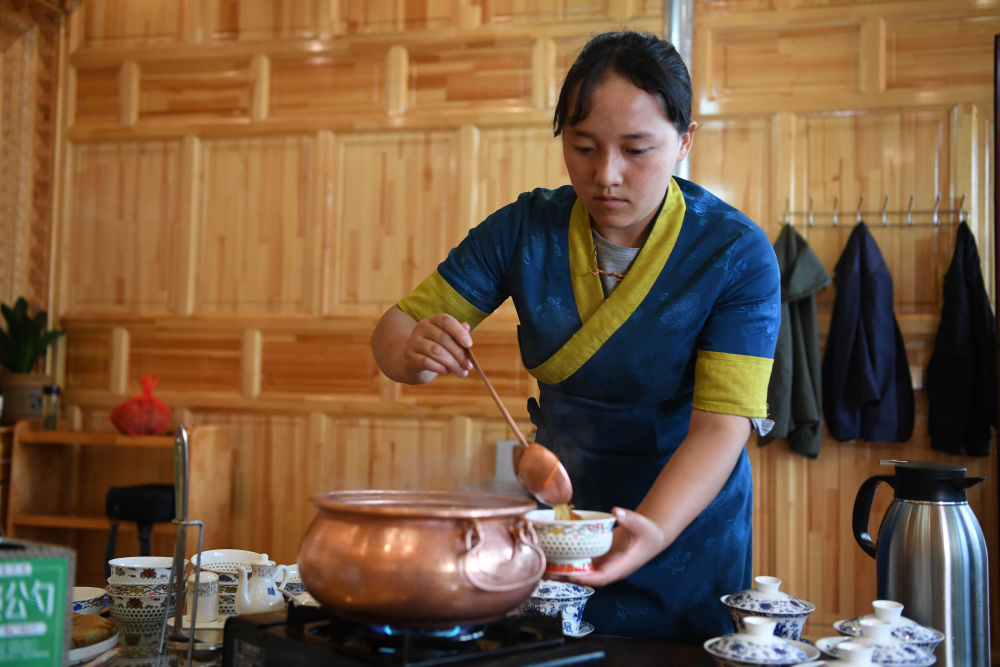 在甘肃省甘南藏族自治州卓尼县木耳镇力赛村的一家农家乐里,村民拉姆卓玛为客人盛汤(9月11日摄)。新华社记者 陈斌 摄