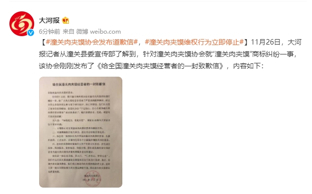 11月26日@大河报消息,大河报记者从潼关县委宣传部了解到,针对潼关肉夹馍协会就“潼关肉夹馍”商标纠纷一事,该协会刚刚发布了《给全国潼关肉夹馍经营者的一封致歉信》,内容如下: