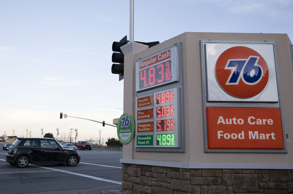 11月16日,车辆经过美国加利福尼亚州旧金山湾区米尔布雷一家加油站。(新华社发,李建国摄)