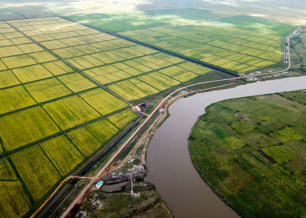 这是2019年4月7日无人机拍摄的莫桑比克万宝莫桑农业园的水稻田。万宝莫桑农业园是中国在非洲最大规模水稻种植项目,极大地缓解了莫桑比克粮食短缺问题。新华社记者张宇摄