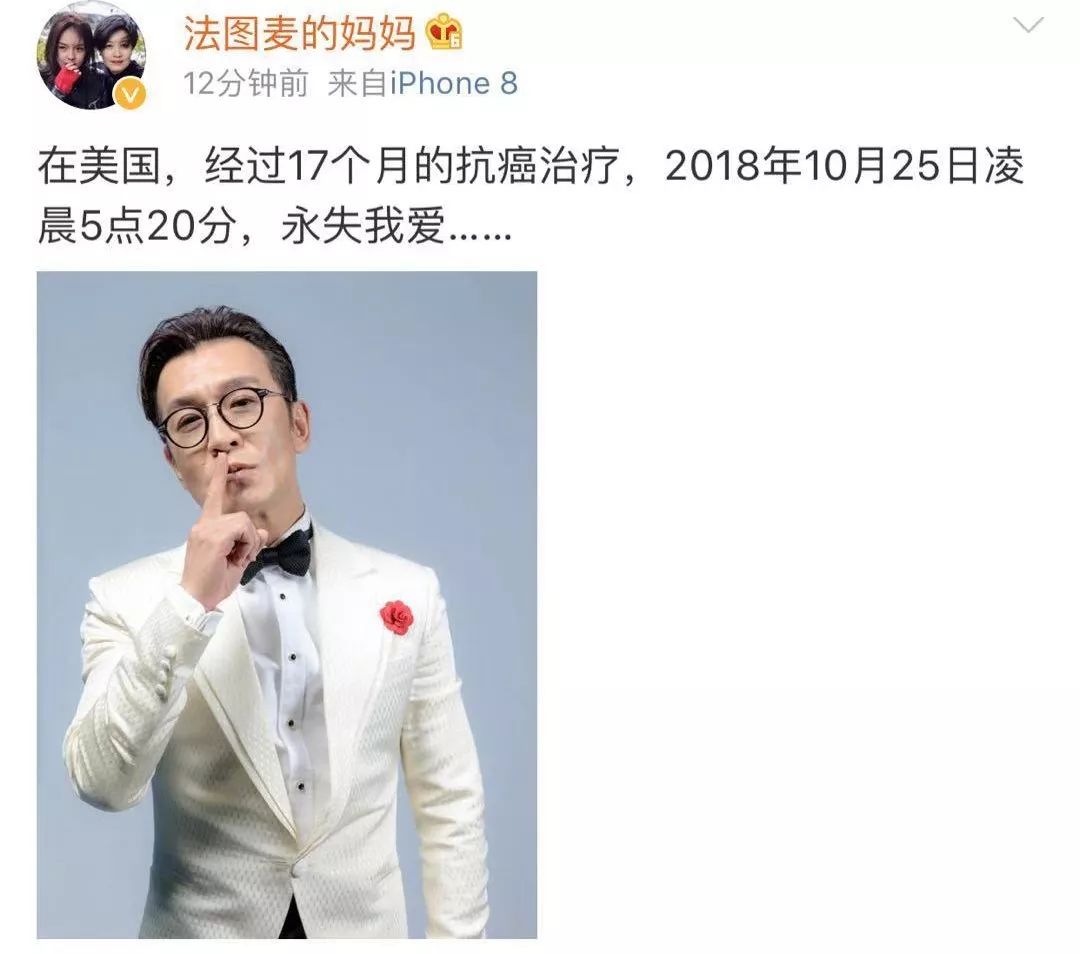 “在美国,经过17个月的抗癌治疗,2018年10月25日凌晨5点20分,永失我爱……”