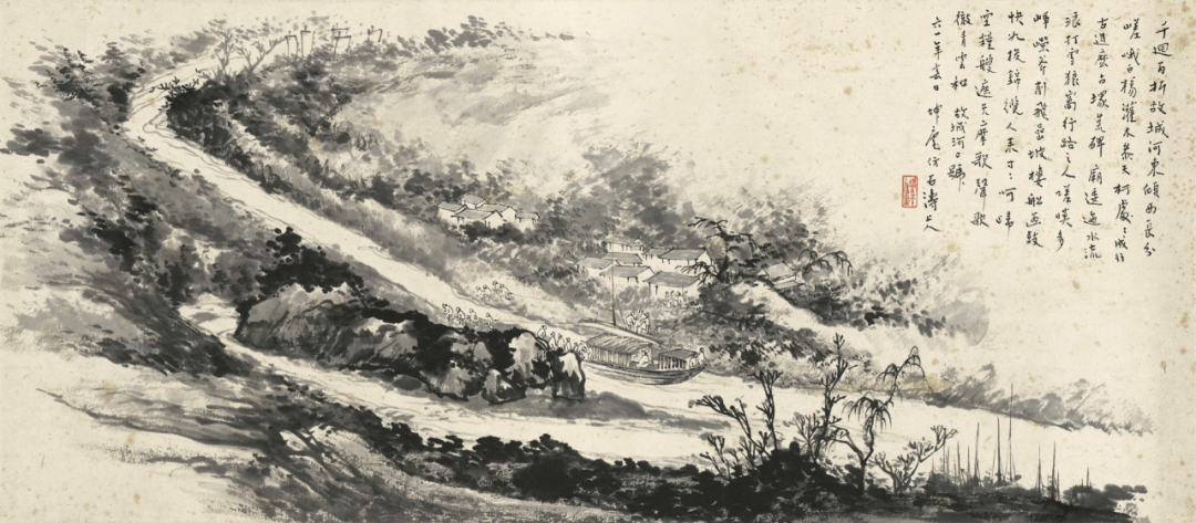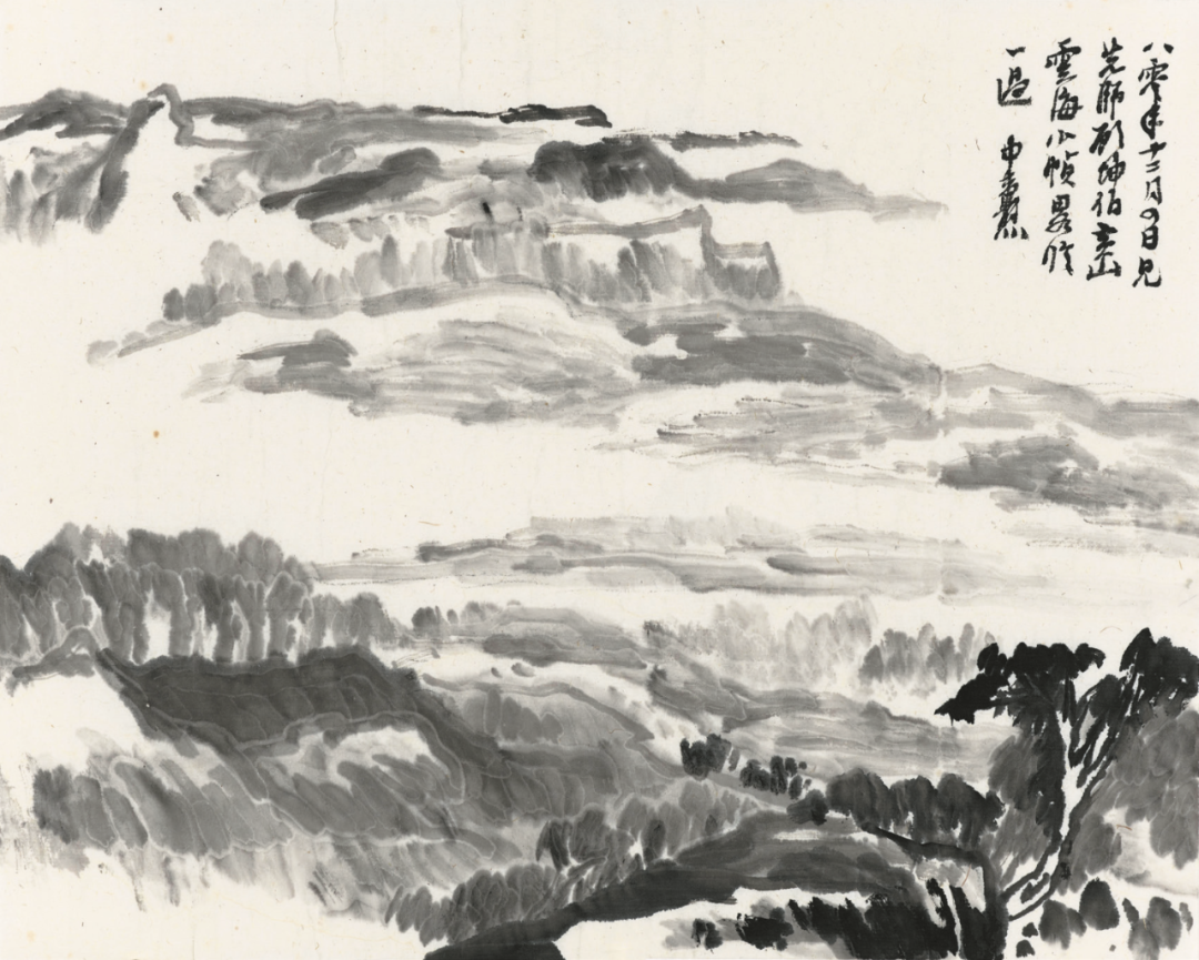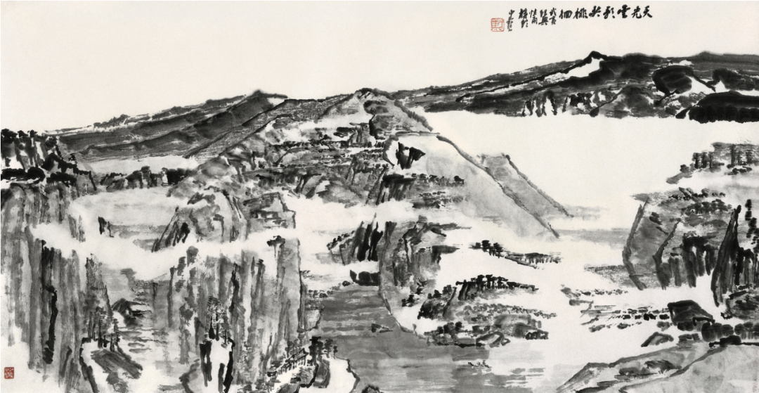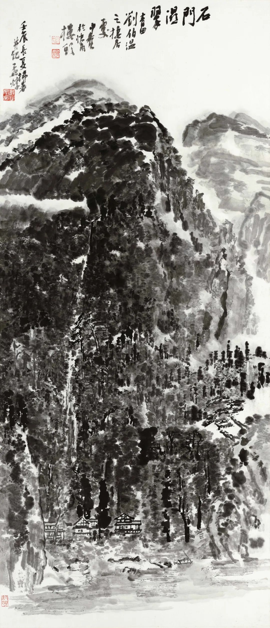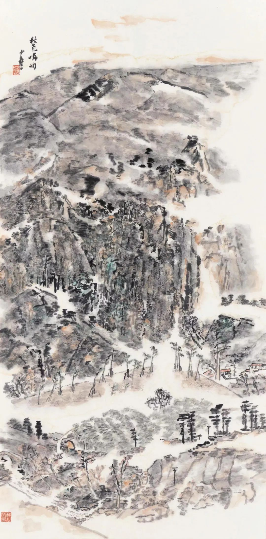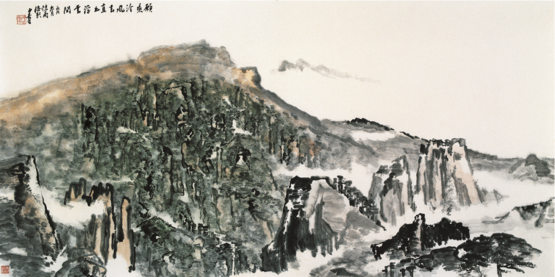 凡写生创作,抓住景物的个性化特色,达心之所往,是笔墨表现之重。在此幅中,“湿”与“翠”两字,便是搜罗自然、体悟达心、研磨至理的笔墨之重点。奇峰沐雨,山岚微湿。远观,林木葱郁,山色凄迷,焕发青翠的光晕。近看,树木积点成林,山岳积点成体。有界的笔墨和多层次的艺术表现因素,与无界的留白关联、贯穿、相融,形成万物生机复苏的意境。清代布颜图《四友斋丛说》言:“隐显叵测,而山水之意趣无穷矣。绘山水隐显之法,不出笔墨浓淡虚实。”清代沈宗骞说:“以笔取形,以墨取色......能得其道,则情态于此见,远近于此分,精神于此发越,景物于此鲜妍。”酌理体会,每每写生创作,于新境拓出,尤觉古人精研功深。