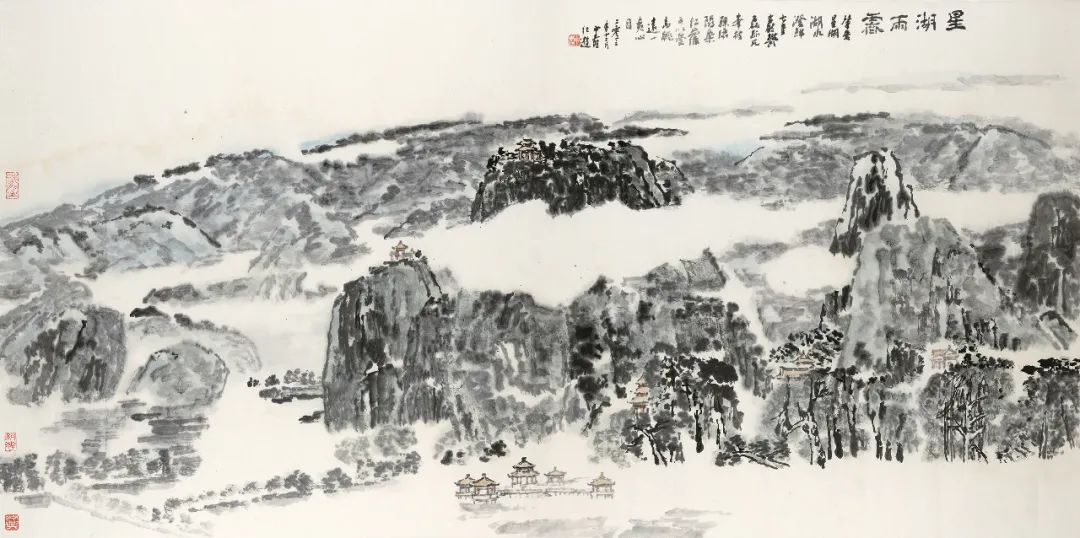 在《星湖雨霁》中,树干勾勒,树叶排叠,无一雷同。每一山,有一个性。或线面结合,留白结顶;或以面为主,勾勒辅之;或积点成面,见笔铺毫而成。《易·系辞》言“生生之谓易”“通之为事”“化而裁之谓之变,推而行之谓之通”“通则变,变则久”。世界是变化的,笔墨在变化中发展。