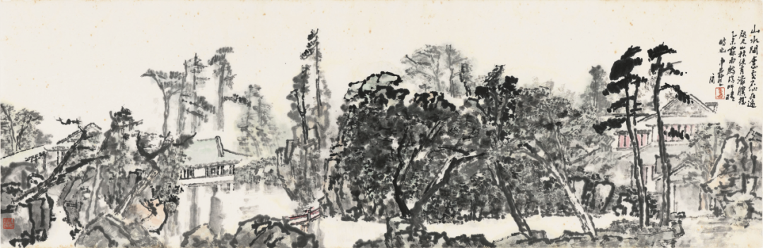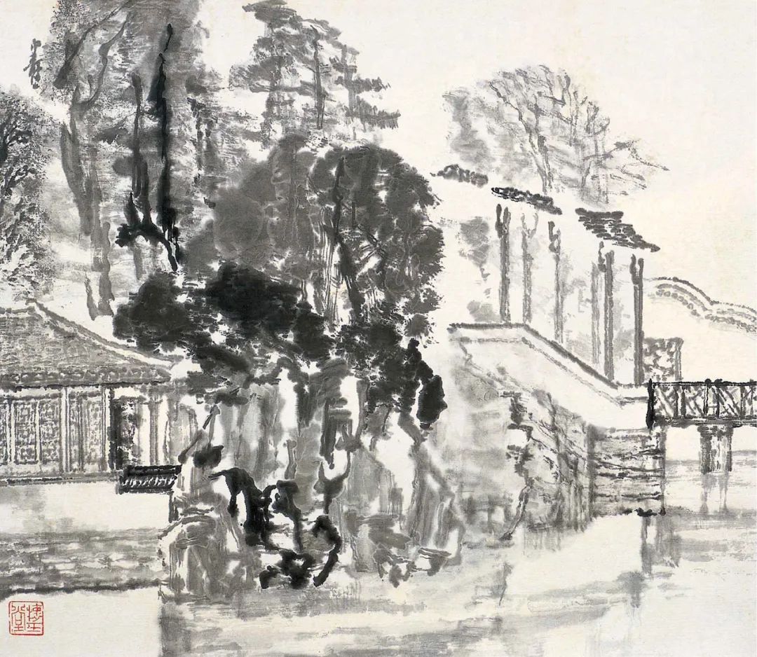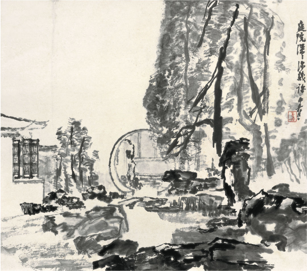 画面的简当舒放,在于对笔墨认识和笔墨与心灵的同构,这需要抓住核心主题,来建构形式与内容合一的凸显。《园林一隅》的静波水岸、浓深树丛,衬托着前景,笔致工整的翘角白墙黑瓦,又反衬空托翘角的亭廊,直以留白凸显枯笔的韵致,正如《南田论画》中所说:“笔墨简洁处,用意最微。运其神气于人所不见之地,尤为惨淡。此惟悬解能得之。”因而抛开繁琐的沉渣之思与虚浮的对象外饰,捕捉自觉所感,直扣心之所望。