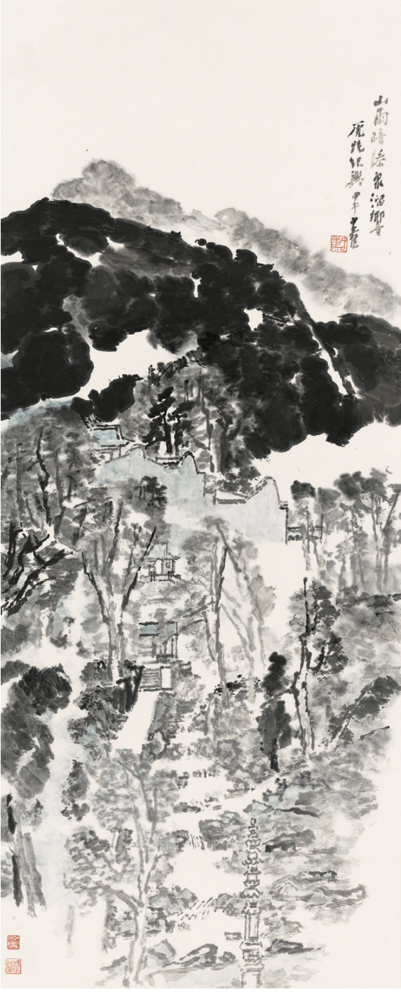 《虎跑纪兴》是根据多幅现场速记,通过整合、精研、处理,简记精化而创作的一则画例。画面微雨趋歇,山石温润,林木青翠,石径、溪流绕山,楼台墙垣伫立,以凸显清刚朴厚之笔墨、眀净淡逸之气格。