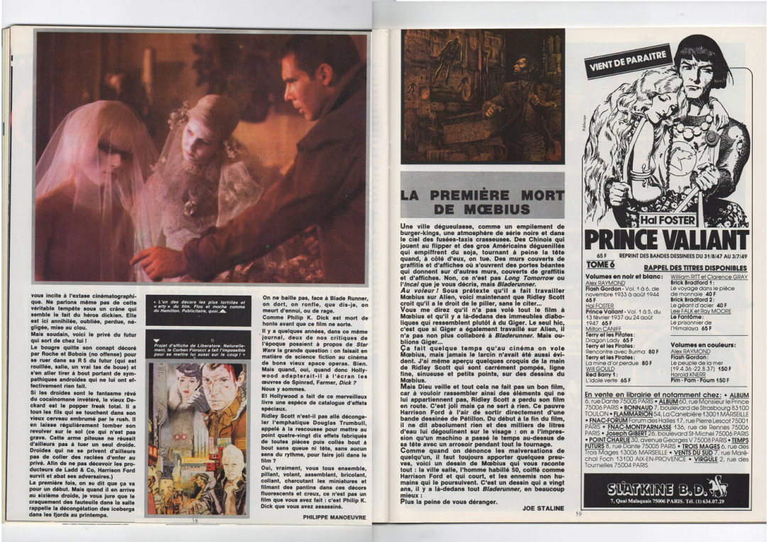 据说,当“赛博朋克”科幻电影的标志性作品《银翼杀手》上映之后,遭到了来自《金属狂哮》多篇文章声讨,认为其剽窃了墨比斯的作品。法国科幻漫画对后世科幻作品的影响可见一斑。