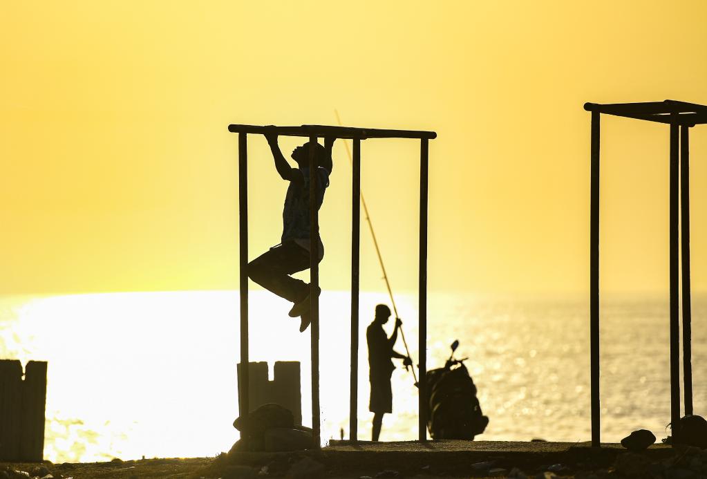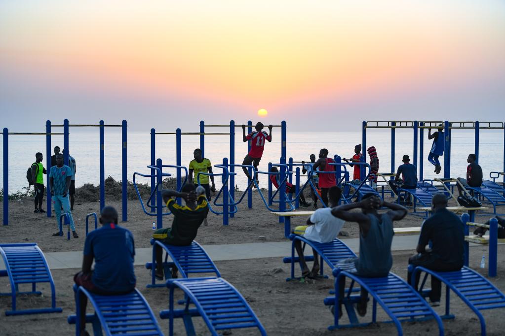 夕阳西下,海浪声声。塞内加尔首都达喀尔海滨健身园迎来了一天中最热闹的时刻。热爱运动的年轻人们群集于此,在挥汗如雨中享受运动带来的快乐。