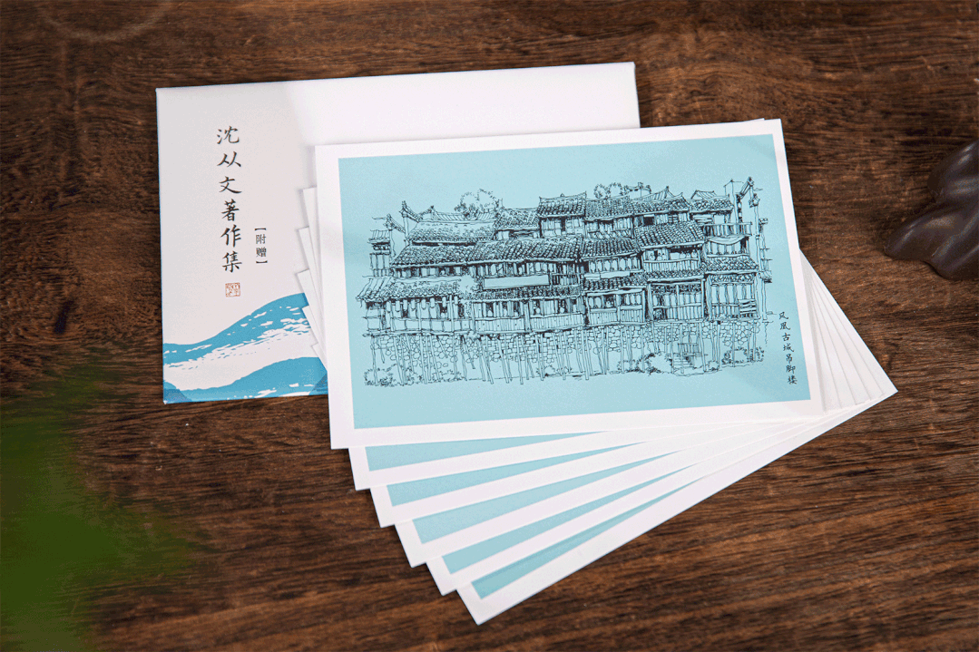 套装附赠了6幅的湘西手绘插图卡片,精致美好,再现沈从文魂牵梦萦的故乡场景: