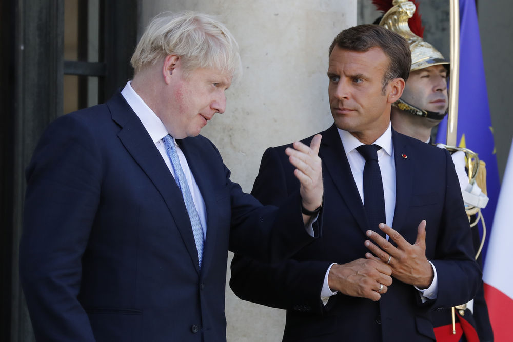 2019年8月22日,在法国巴黎,法国总统马克龙(右)与来访的英国首相约翰逊交谈。(新华社发,杰克·陈摄)