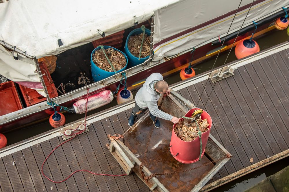 11月5日,在法国北部海滨城市滨海布洛涅,一位渔民从出海归来的渔船上卸货。英国“脱欧”后,围绕法国渔船在英国海域的捕鱼权问题,两国已争执数月。 (新华社发,塞巴斯蒂安·库尔吉摄)