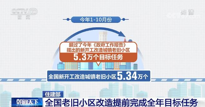 经汇总各地统计、上报情况,今年1—10月份,全国新开工改造城镇老旧小区5.34万个,超过了今年《政府工作报告》提出的新开工改造城镇老旧小区5.3万个目标任务。其中,上海、安徽、新疆生产建设兵团、广东、内蒙古、北京等26个省区市今年计划任务已全部开工。