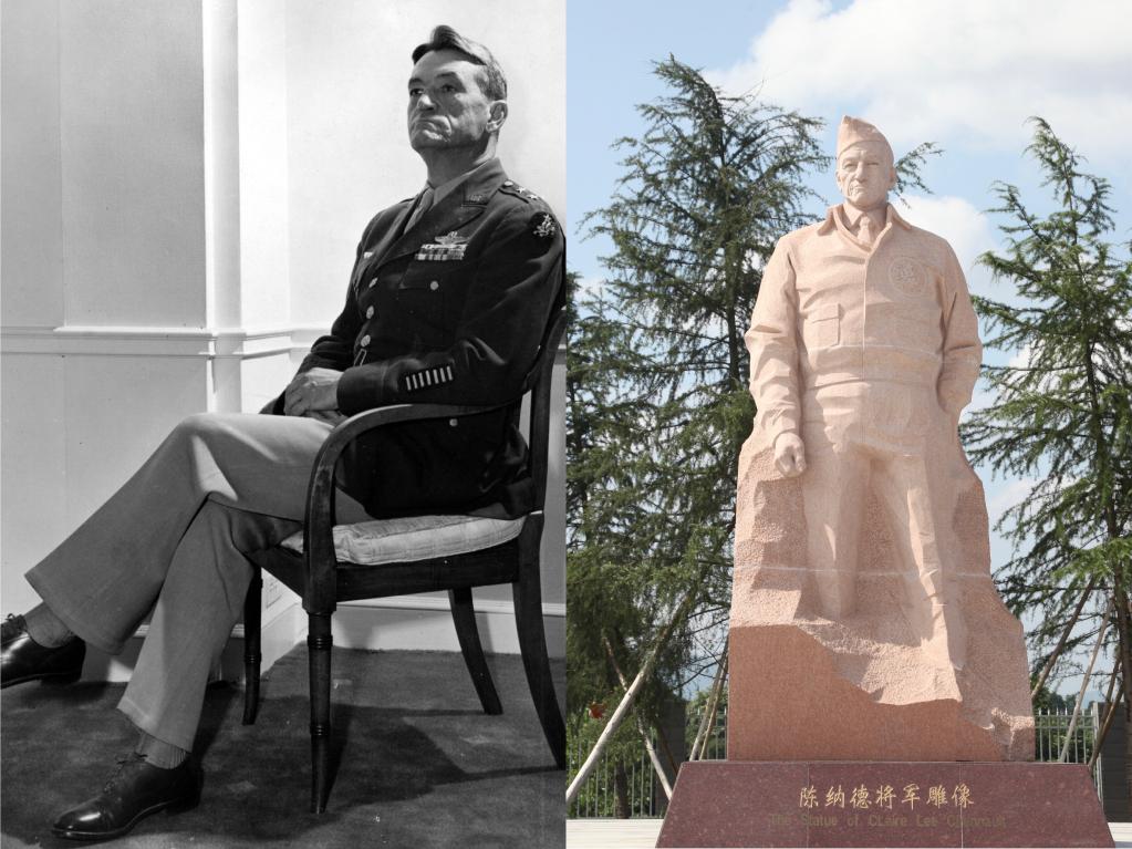 (拼版照片:左为陈纳德肖像照,右为芷江飞虎队纪念馆内陈纳德雕像)