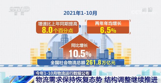 1—10月,全国社会物流总额为261.8万亿元,同比增长10.5%,增速比上年同期提高8.0个百分点,两年年均增长6.5%。