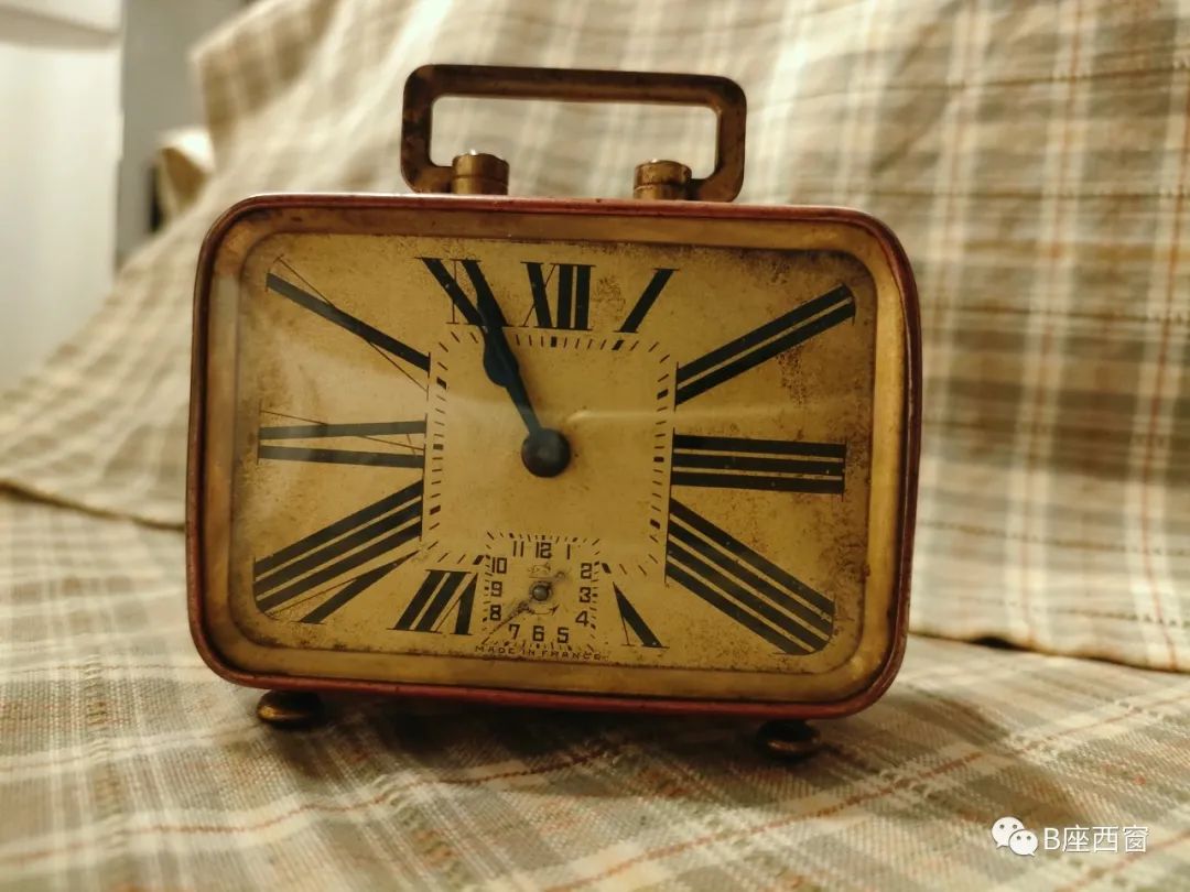 回家后,仔细观察,发现小钟的背面除了校准时间、指示发条扭转和闹钟开关的法文,还刻有一行“Breveté SGDG”的字样,旁边另依稀可见一个手刻的“1907”。根据Google上搜索到的信息,“Breveté SGDG”是1850到1950年间在法国生产的钟表的一种通用标识,常见于表身背面,并不代表某一个品牌或系列。这样一来,姑且可认为我这个无名的小小机械钟至少诞生在上个世纪中叶以前。这个发现让我一下子兴奋起来,仿佛自己买圣诞彩票中了头奖!但也正因为它的高龄,在接下来的一个星期里,除了每天要一大早给它拧紧发条,我还必须时不时校准一下慢个三五分的指针。