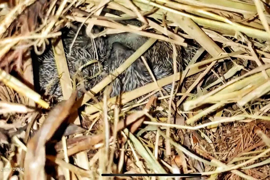 当我屏住呼吸来到那个整理箱前的时候,首先看到的是食物都被吃了、小刺猬们不见了,然后我轻轻拨开一层一层的稻草,看到三只小刺猬蜷缩在侧躺的母刺猬身边,看起来温馨,摸起来温暖——虽然我没有摸小刺猬,因为我知道那纯属捣乱,但摸到它们附近的稻草就能感受到温度。当我看到这一幕的时候,显然也惊扰了刺猬一家,它们小小地骚动了一下,我赶紧把稻草盖了回去。母刺猬继续给小刺猬们喂奶了,这是肯定的答案,也是我们最期待的结果。