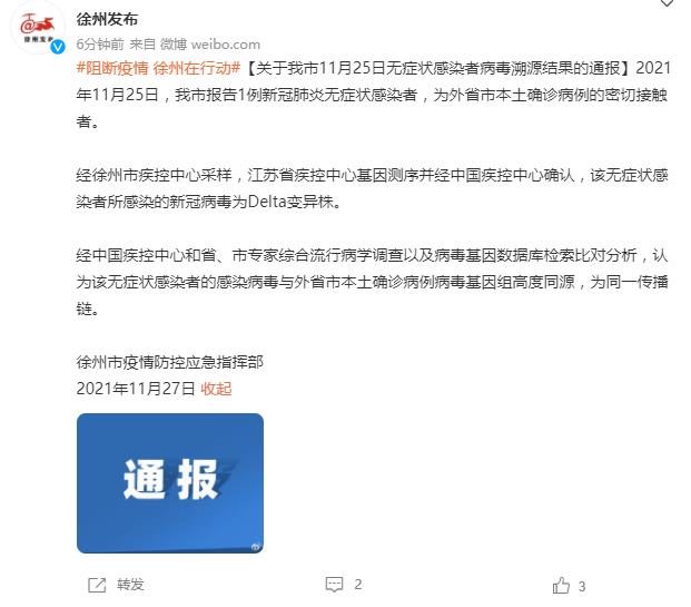 @徐州发布 微博消息,徐州市疫情防控应急指挥部通报,2021年11月25日,徐州市报告1例新冠肺炎无症状感染者,为外省市本土确诊病例的密切接触者。
