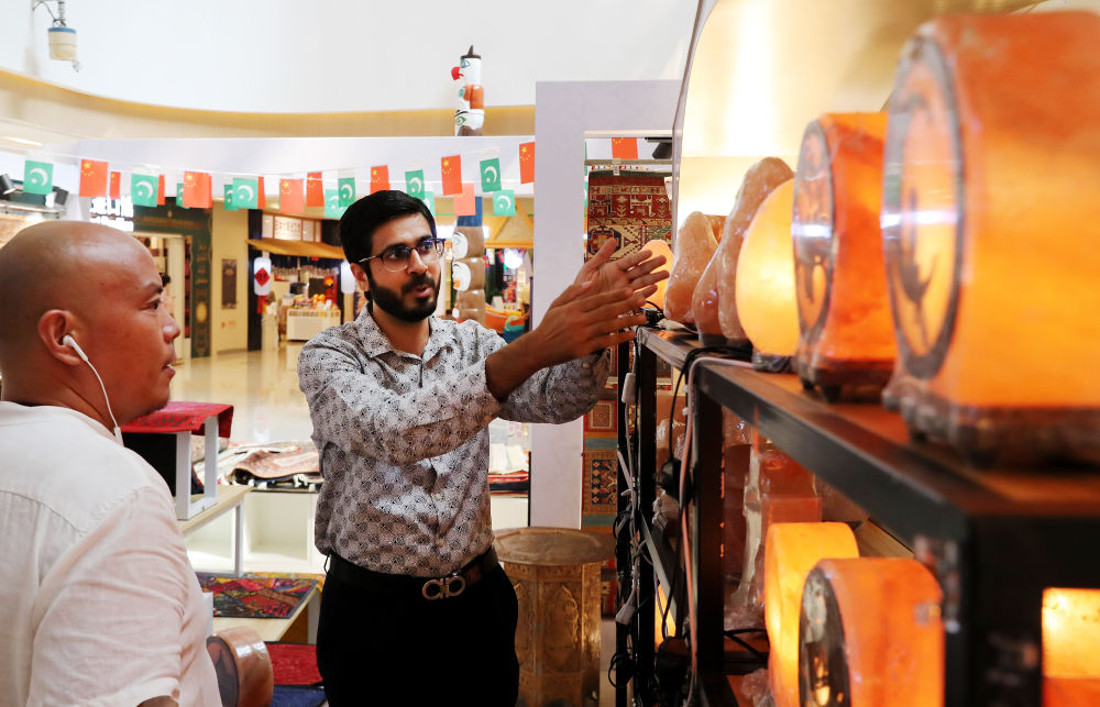 来自巴基斯坦的哈比(右)在位于上海绿地贸易港的商铺内向顾客讲解盐灯的特点和制作过程(2021年9月7日摄)。中国国际进口博览会向世界各国展现了中国市场所蕴含的巨大潜力,越来越多的国外客商乘着进博会的“东风”来投资创业,希望将他们的商品带进中国并得到市场的认可。新华社记者方喆摄