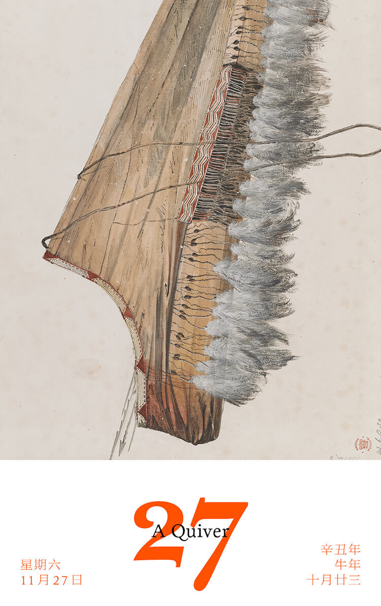 这幅画描绘的是印第安人的箭囊,由库克船长第三次远航的随行画家约翰·韦伯1778年绘制。