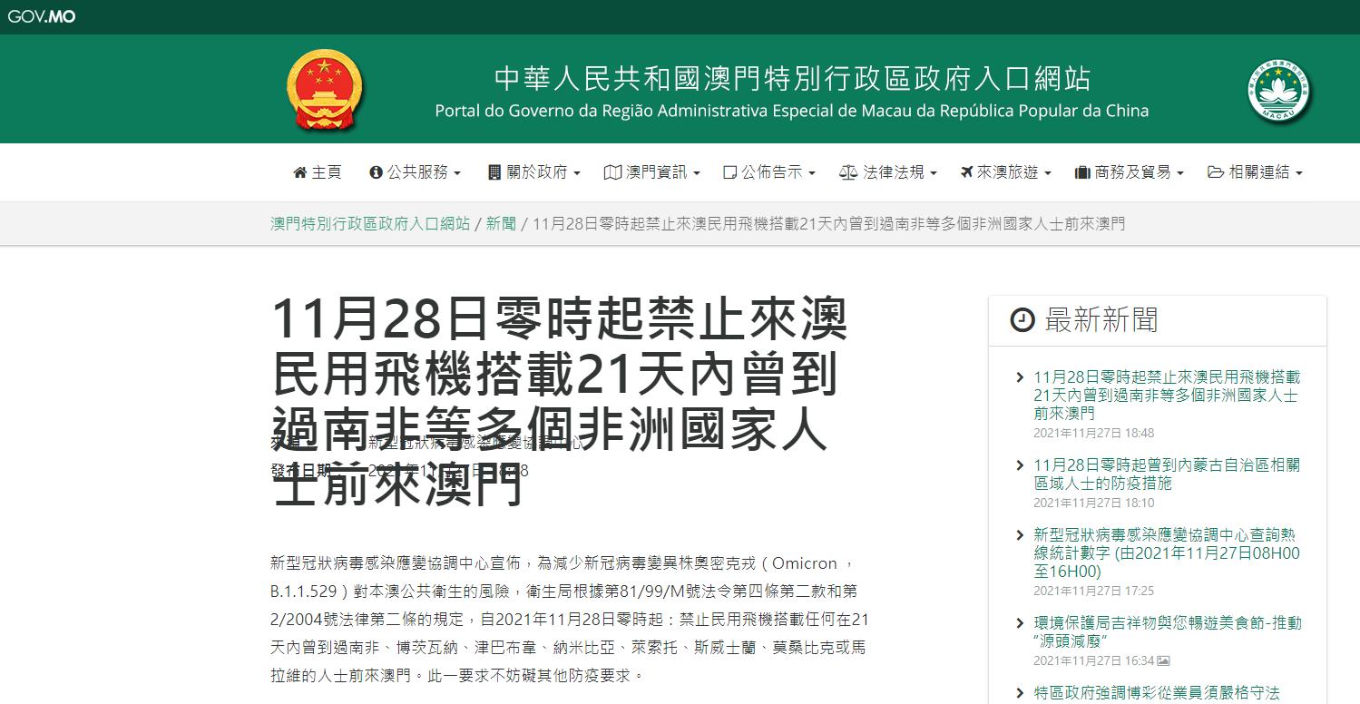 11月27日,澳门特区政府网消息,澳门新型冠状病毒感染应变协调中心宣布,为减少新冠病毒变异株奥密克戎(Omicron ,B.1.1.529)对澳门公共卫生的风险,卫生局根据第81/99/M号法令第四条第二款和第2/2004号法律第二条的规定,自2021年11月28日零时起:禁止民用飞机搭载任何在21天内曾到过南非、博茨瓦纳、津巴布韦、纳米比亚、莱索托、斯威士兰、莫桑比克或马拉维的人士前来澳门。此一要求不妨碍其他防疫要求。