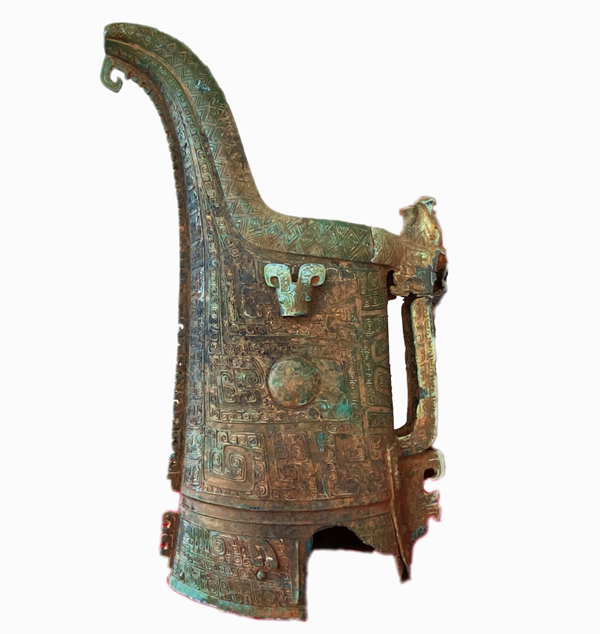 出土时,铜觥侧置平放,铜壶倒置于铜觥内。铜觥重13.45千克,器身呈扁圆形。考古专家称,该铜觥器形独特,如突出眼睛的变形兽面纹、“C”形扉棱、羊角腾空设计的平嘴牺首等,与以尊、罍为代表的殷墟时期南方特征青铜器相一致。