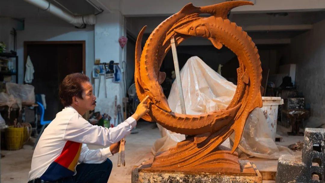 11月初的立冬时节,阴阳转换,万物收藏。当天,许鸿飞正创作一组“三鱼”雕塑。它们首尾相接,成为圆环,既充满力量,在水底掀起波澜,又让人联想到幸福美满,团团圆圆。构思巧妙,做工精致。