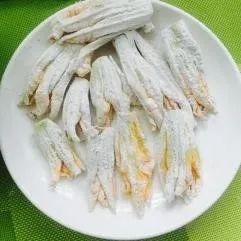 不结瓜的花叫谎花,留着也没用,于是有人想出了一种美丽的吃法——南瓜花托面。有时候,奶奶会在大清早摘一捧花回来,她把面粉加水和成面糊,撒上少许细盐和葱姜末,然后把一朵朵喇叭形的黄灿灿的南瓜花放进面糊里打几个滚,最后放进油锅里炸至金黄。这样,一朵朵南瓜花托面就做好了,吃起来又香又脆,摆在盘子里还很好看,现在连大饭店也做这道菜呢。只可惜南瓜花数量少,不能经常吃到。