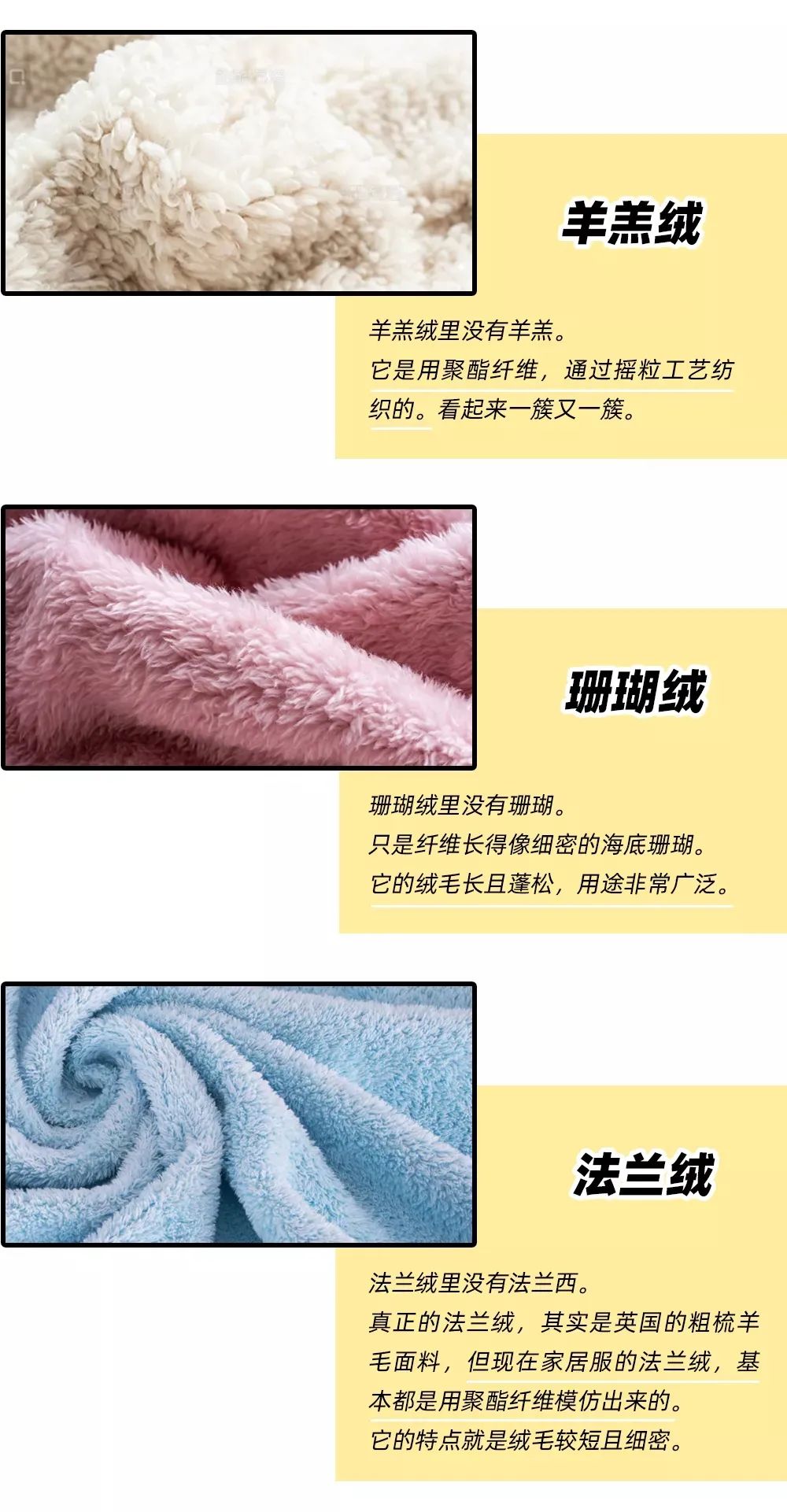 其实不管羊羔绒、珊瑚绒、法兰绒的名字多浪漫,它们基本都是 100% 聚酯纤维。(*聚酯纤维就是大家常说的涤纶)