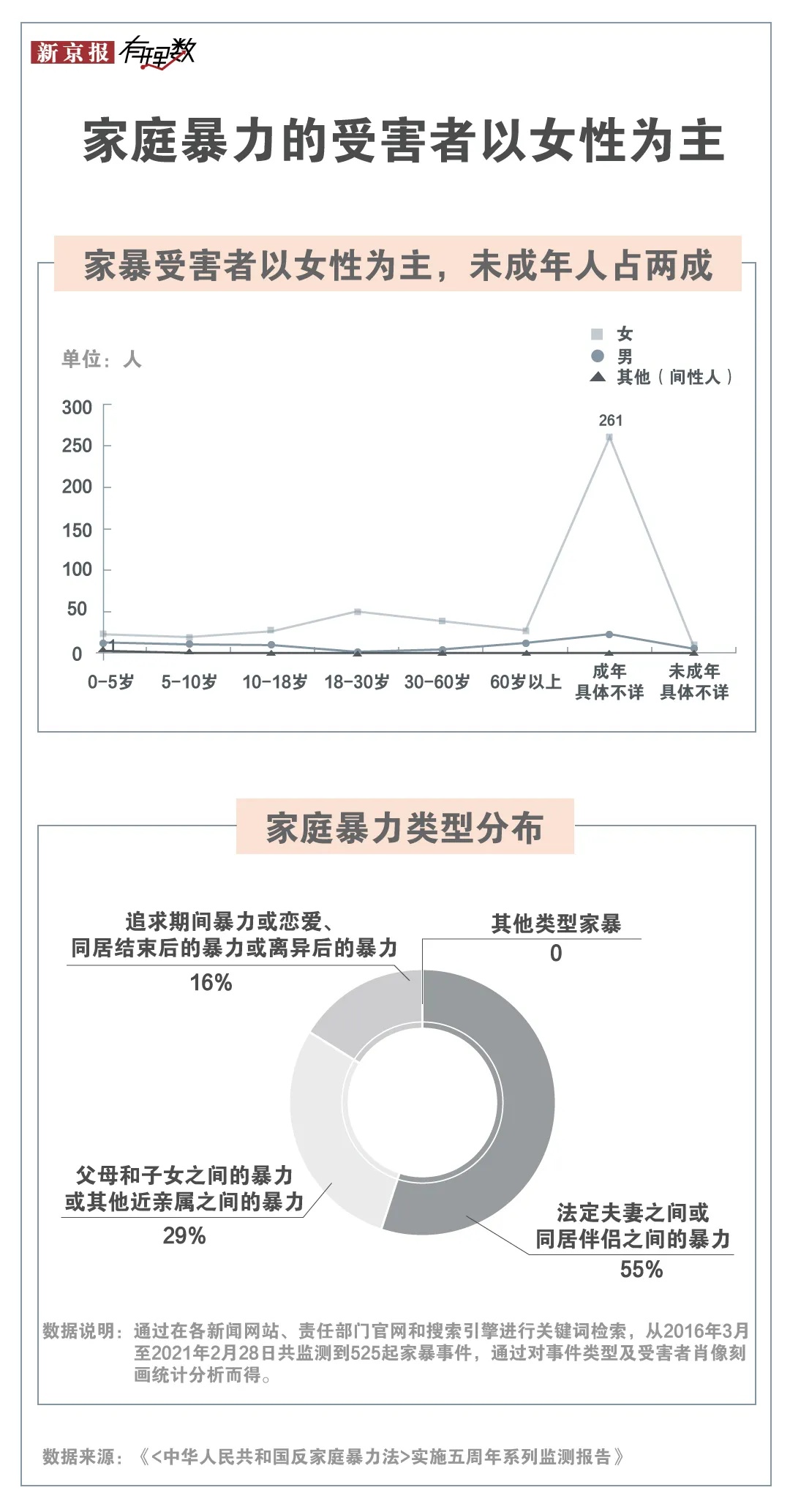 家庭暴力的形式有多种,法定夫妻之间或同居伴侣之间的暴力行为是最常见的。《实施五周年系列监测报告》数据显示,在其监测的525起家暴事件里,有超过一半都是夫妻之间或同居伴侣之间的暴力行为,这一比例达到55%。