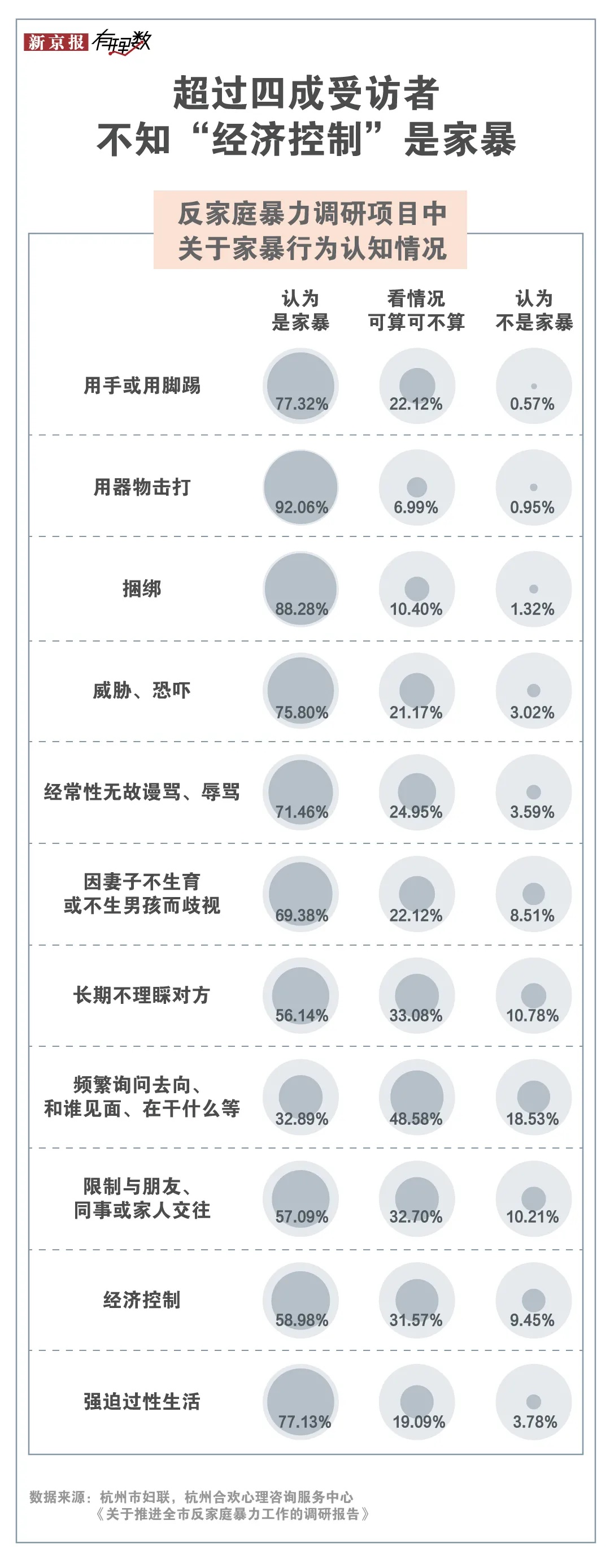 2018年杭州妇联一项关于居民对家暴行为认知调查显示,大部分人对行为暴力、精神暴力和性暴力等的认知态度较为统一,但对于经济控制、行为控制、冷暴力等行为认知不足,对家庭暴力的前期征兆以及其他形式的了解远远不够