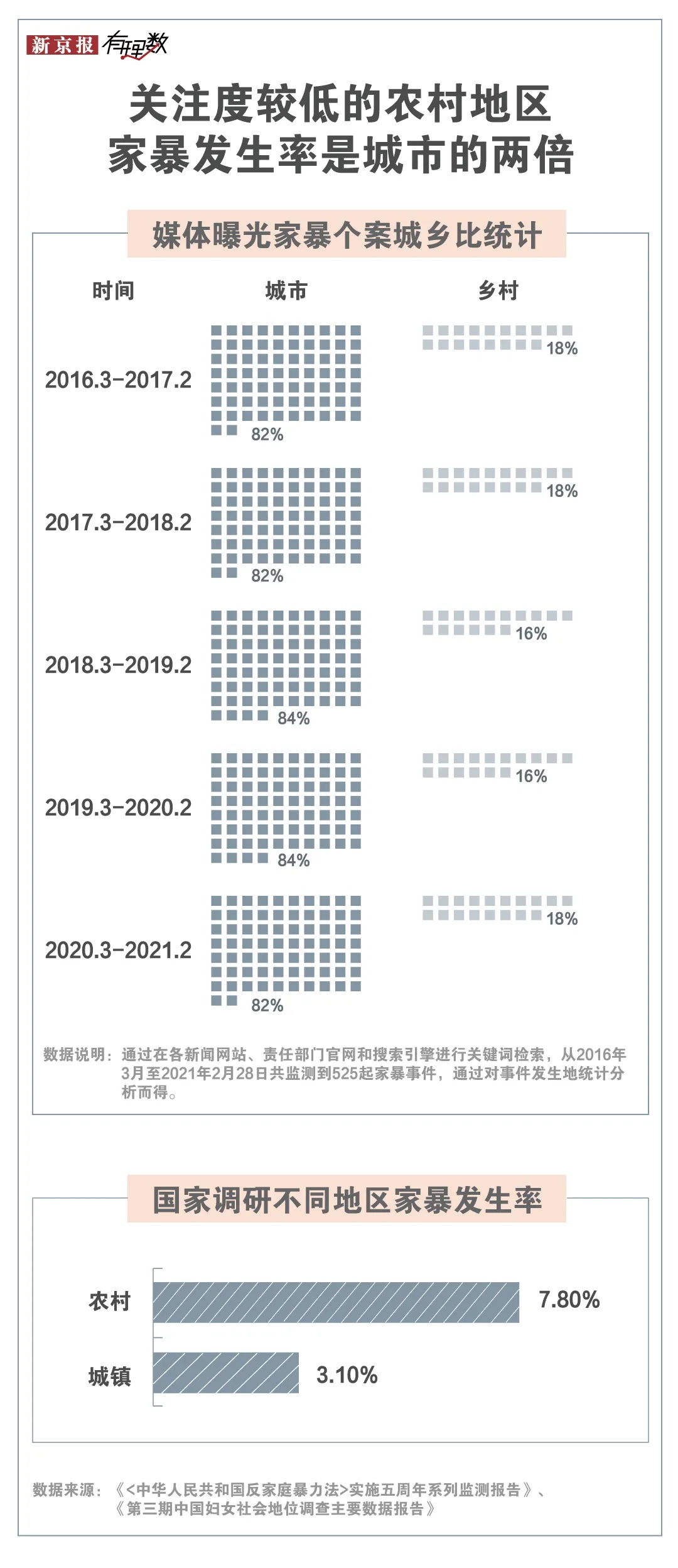 但在反家暴法实施五周年监测报告中媒体报道的525个案例里,约有八成发生在城市,农村占比不到两成,农村发生的家暴进入媒体视野的几率偏少。