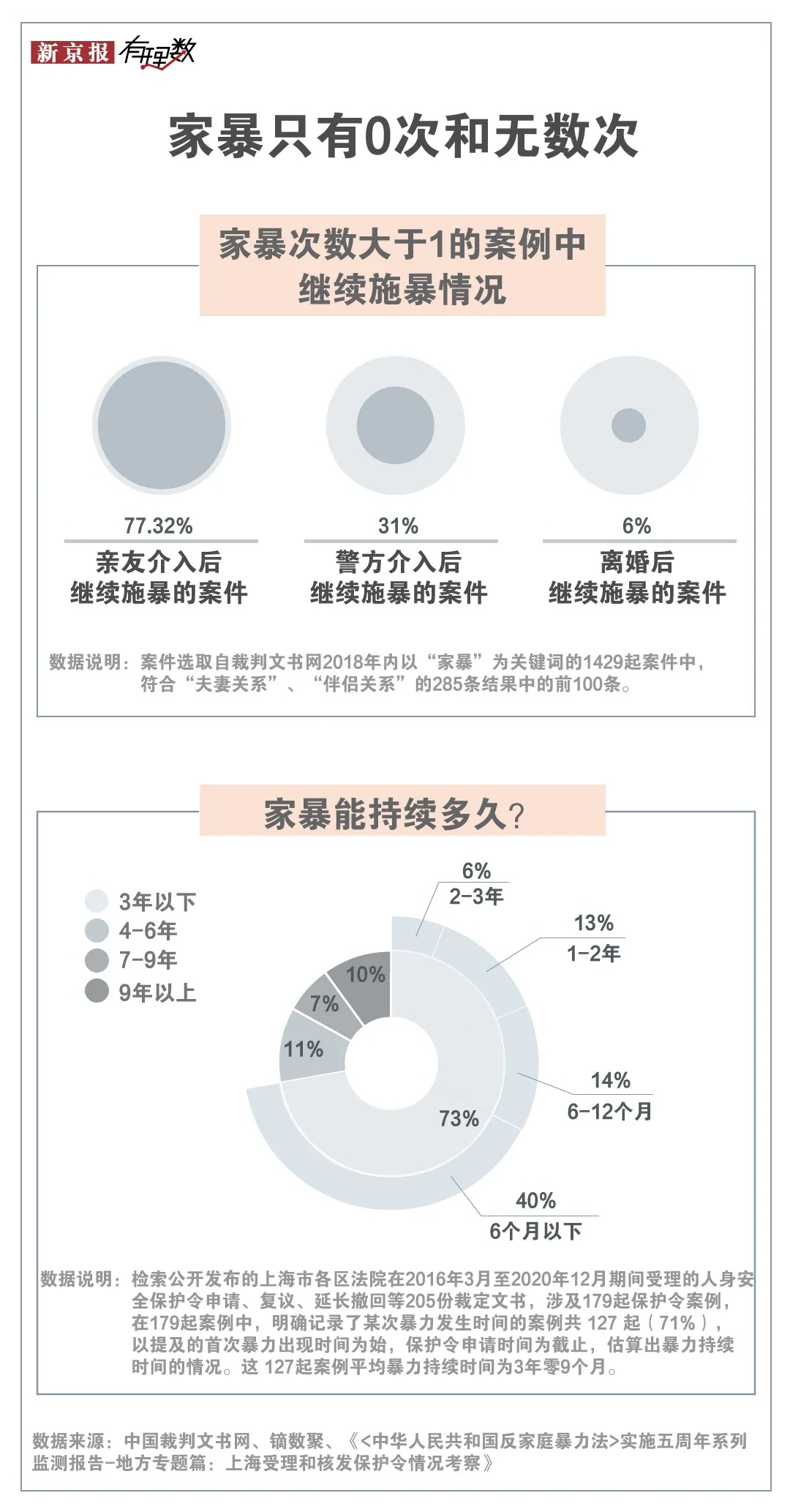 《上海受理和核发保护令情况考察》报告里显示,在其监测的179起案例中,明确记录了某次暴力发生时间的案例共127起,平均暴力持续事件为3年零9个月。