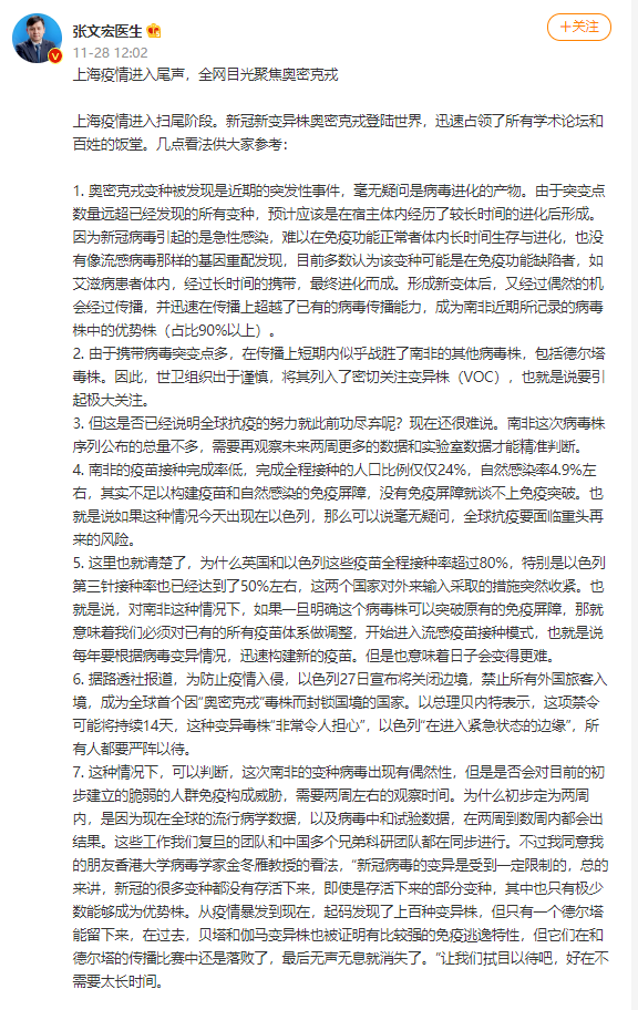 @张文宏医生 11月28日在微博发文: