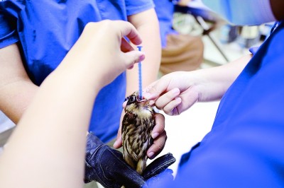 北京猛禽救助中心工作人员为一只红脚隼喂药。