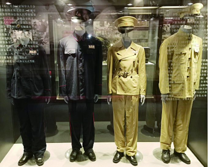 1950年2月11日,周恩来总理批准了《公安部及其所属武装部队服装样式草案》,这就是新中国第一代制式警服——五○式警服,并随即装备全国公安民警。五○式警服冬装为墨绿色棉衣,夏装为米黄色单衣。上衣口袋为平袋,佩戴“中国人民警察”布质胸章以及绿底黄字的黄铜领章,右领为“人民警察”字样,左领按警种缀钉“治”“户”“交”“消”字首和警号,下衣为马裤、打绑腿(1951年取消)。女警服为列宁装,扎布腰带。帽徽为黄边红五角星,内嵌“公安”字样。