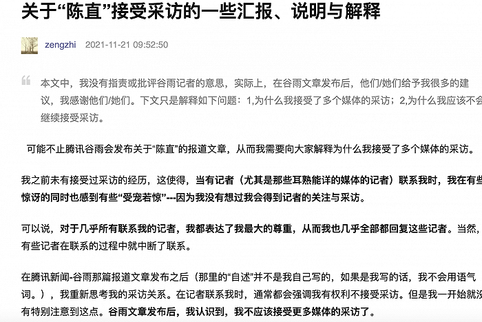 至少在谷雨的文章发布后,陈直已经在豆瓣上表达了自己的态度,他对自述体裁以及由此引发的围观是不适的。作为一种新闻人物稿的写作方式,自述当然可以说有自己的一套规范,但我还是很好奇,自述的内容到底是怎样生产出来的呢?是记者一开始就和受访者沟通,确定要写一篇自述稿,请对方事先准备,还是两个人闲聊漫谈,最后由记者整理出受访者第一人称自述?尽管文章开头就写明了记者编辑信息,标明下列文字的归属,但自述这样的视角岂不会将责任又引回到自述者身上吗?告诉别人你需要公开地讲一段自己的经历,这和跟他闲谈,再把自己的话抽掉,按照自己的逻辑来组织对方的话语,这是很不一样的两件事。