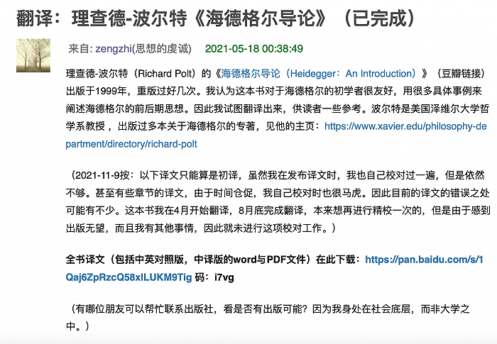 近期,一位名叫陈直的农民工因为阅读翻译海德格尔的事件引发了不小的讨论。事情缘起是谷雨公众号刊发了自述体文章《一个农民工思考海德格尔是再正常不过的事》,文章记录了陈直放弃大学学业、一边打工一边进行哲学研究的经历。随后也有媒体针对此事发表文章。互联网的讨论中大概体现出两拨意见:一方批评者主要从生活与学术的关系以及男人对家庭的责任出发,认为陈直在文章中表现出来的对妻儿的疏忽是不可以用学术的名义原谅的;而另一方人士主张捍卫农民工研究哲学的正当性,认为人们不理解农民工阅读翻译海德格尔本身是充满偏见的,工人与知识阶层之间不应当有如此难以逾越的壁垒,而这篇文章本身恰好证明了这种壁垒的存在。陈直本人也在豆瓣对此事件有所回应。