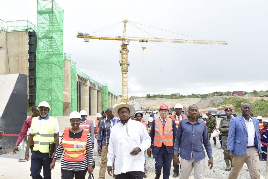 2018年8月23日,在乌干达基里扬东戈地区,乌干达总统穆塞韦尼(前排中)视察卡鲁玛水电站建设工地。穆塞韦尼参观了由中国水利水电建设集团公司(中国水电)总承包的卡鲁玛水电站在建工程,称赞项目建设出色。(新华社发,乌干达总统府新闻部提供)