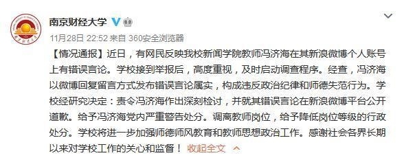 南京财经大学28日通过官方微博发布通报称,近日,有网民反映该校新闻学院教师冯济海在其新浪微博个人账号上有错误言论。学校接到举报后,高度重视,及时启动调查程序。经查,冯济海以微博回复留言方式发布错误言论属实,构成违反政治纪律和师德失范行为。