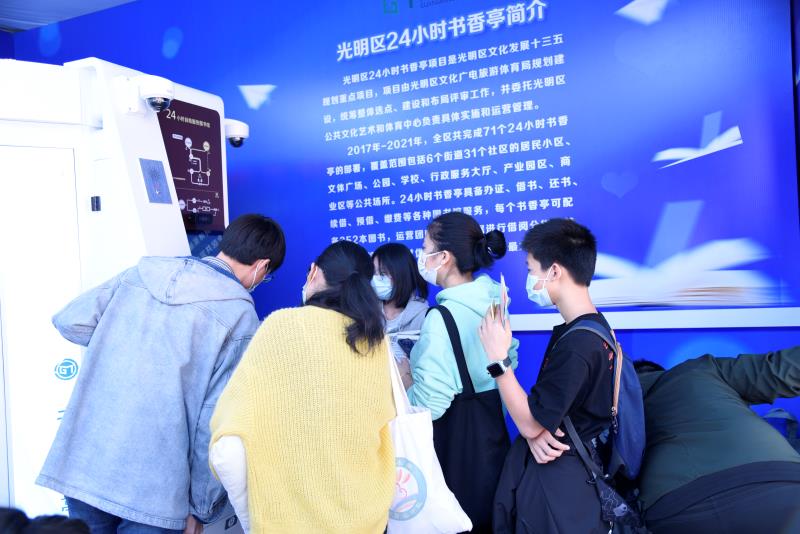 本次活动,光明区24小时书香亭也向读者们展示了方便快捷的借阅服务。光明区书香亭是光明区文化发展十三五规划的重点项目,2017年-2021年,全区共完成71个24小时书香亭的部署,覆盖范围包括6个街道31个社区的居民小区、文体广场、公园、学校、行政服务大厅、产业园区、商业区等公共场所。24小时书香亭具备办证、借书、还书、续借、预借、缴费等图书馆功能,每个书香亭可配备352本图书,运营团队通过大数据进行借阅分析,根据人群阅读需求定时优化图书资源配置,最大程度满足市民读者的阅读需求。