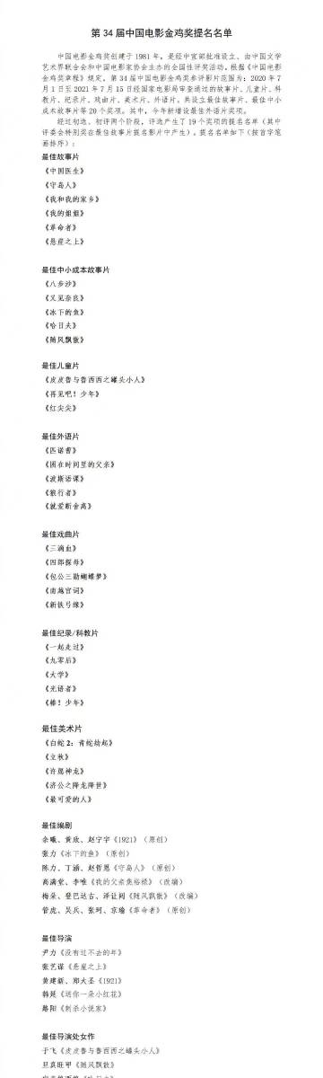 【#第34届中国电影金鸡奖提名公布#】中国电影家协会29日公布第34届中国电影金鸡奖提名名单。其中,《中国医生》《守岛人》《我和我的家乡》《我的姐姐》《革命者》《悬崖之上》入围最佳故事片,于和伟、刘烨、张译、易烊千玺、郭晓东提名最佳男主角,刘浩存、刘敏涛、张小斐、张子枫提名最佳女主角。据悉,2021年中国金鸡百花电影节将于2021年12月28日-30日在福建厦门举办。(记者王鹏、白瀛)