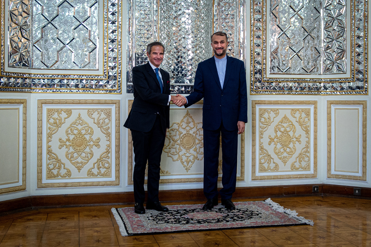 11月23日,伊朗外长阿卜杜拉希扬(右)在德黑兰会见到访的国际原子能机构总干事格罗西。(新华社发)