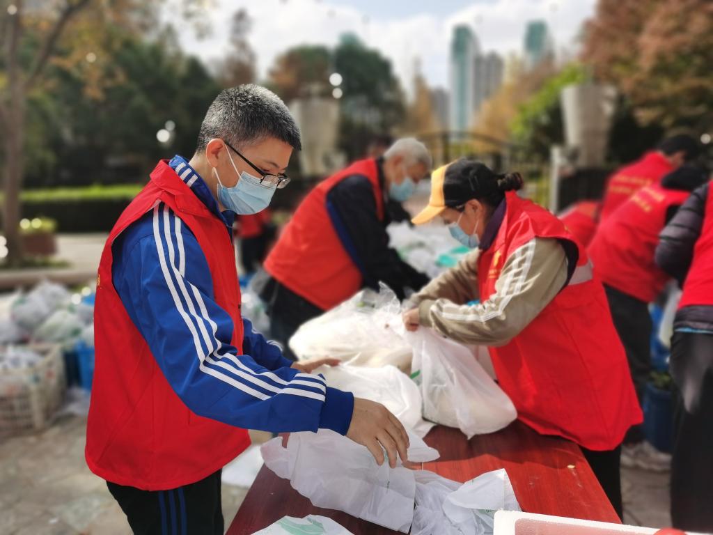 香梅花园一期小区内志愿者为居民分装生活物资。 (受访者供图)