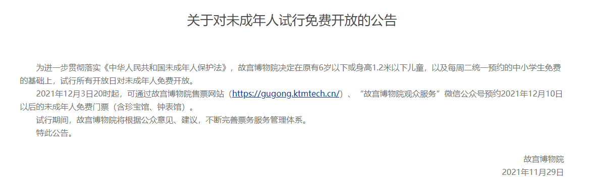 2021年12月3日20时起,可通过故宫博物院售票网站、“故宫博物院观众服务”微信公众号预约2021年12月10日以后的未成年人免费门票(含珍宝馆、钟表馆)。